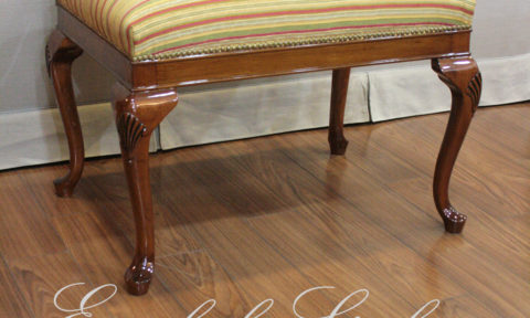 Banqueta modelo Reina Ana con patas talladas, tapizada de manera tradicional: cinchas de yute, resortes de acero, crin vegetal para la forma, manta de algodón. Terminada en seda rayada oro. Lustre Premium base poliéster y terminación poliuretano, color natural de la pluma, brillante. Medidas: 60 cm X 40 cm y 50 cm de alto. Pedí