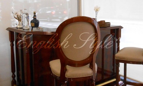 Bar modelo Sheraton con columnas ochavado. Apoya pies en bronce. Construida en caoba y pluma de caoba. Lustre a elección.
