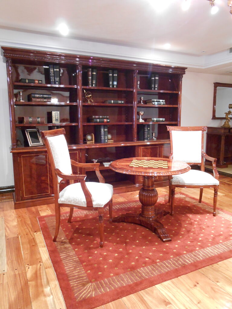 Biblioteca modelo Imperio con medias columnas y perlé en el cornizón. Construida en caoba y pluma de caoba con filetes en guatambú.