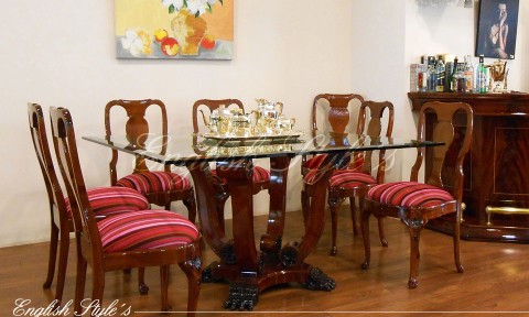 Mesa modelo Reina Victoria, construida en caoba y pluma de caoba con detalles tallados y tapa de vidrio. Silla modelo Reina Ana con asiento curvo; tapizadas con género a elección, cinchas de yute, baranda elástica, resortes helicoidales de acero y crin vegetal. Lustre Premium con base de poliéster y terminación en poliuretano, brillante. Pedí el tuyo