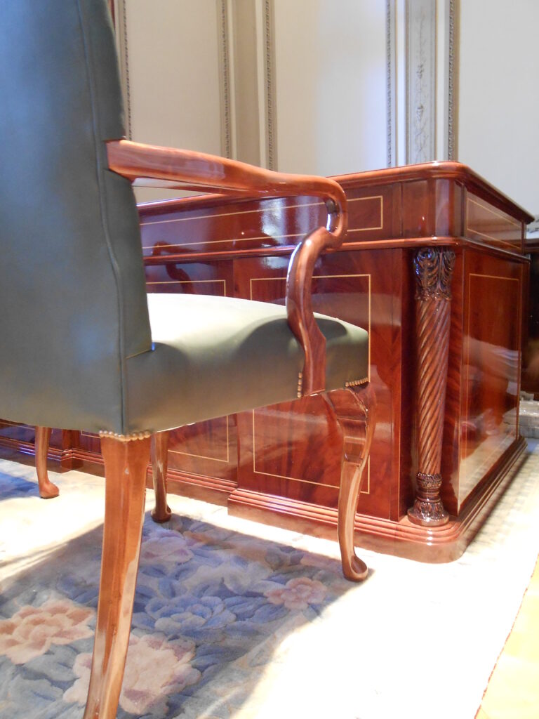 Escritorio modelo Imperio con columna salomónica. Construido en madera de caoba y pluma de caoba con filetes en madera de fresno.
