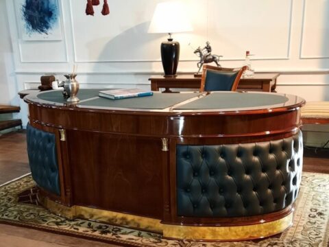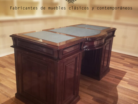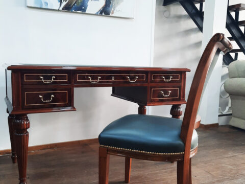 Escritorio modelo Dublin. En la foto, modelo de 180 cm x 90 cm. Fabricado en madera de caoba con 9 cajones encastrados y malletados, tapa de cuero natural y herrajes de bronce macizo. Lustre Premium en tono caoba brillante. Pedí el tuyo en las medidas que gustes, pudiendo elegir la madera, el tono del cuero,