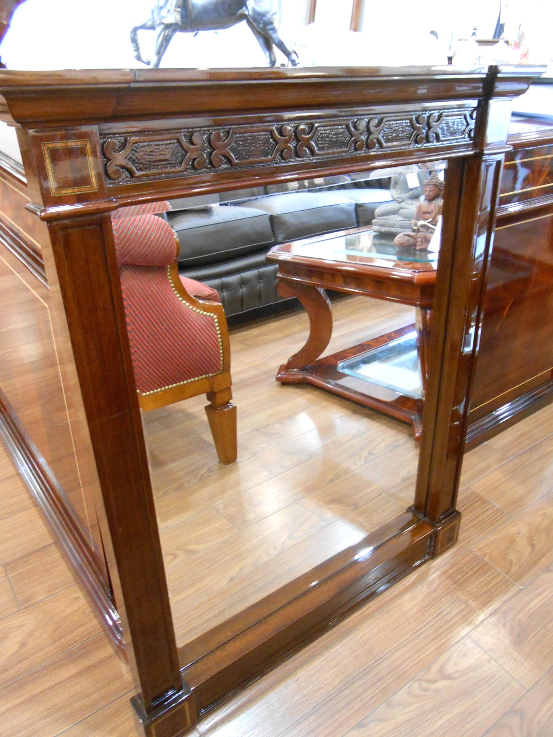 Espejo biselado con marco modelo Imperio, con pilastras y talla en el cornizón. Construido en caoba con filetes en palo rosa.