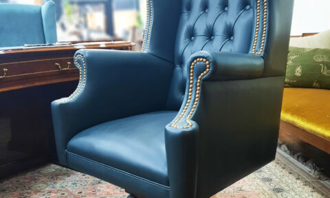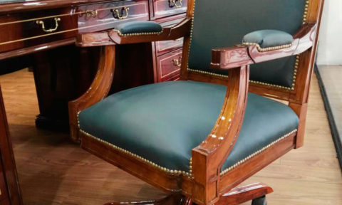Sillón giratorio modelo Berger, tapizado en cuero natural con capitoné y tachas. Equipado con sistema basculante y regulación de altura, ideal para la oficina. Pedí el tuyo tapizado en tela o cuero, podés elegirlo con o sin capitoné y sin tachas, además de elegir el tono y brillo de las patas para que acompañen los