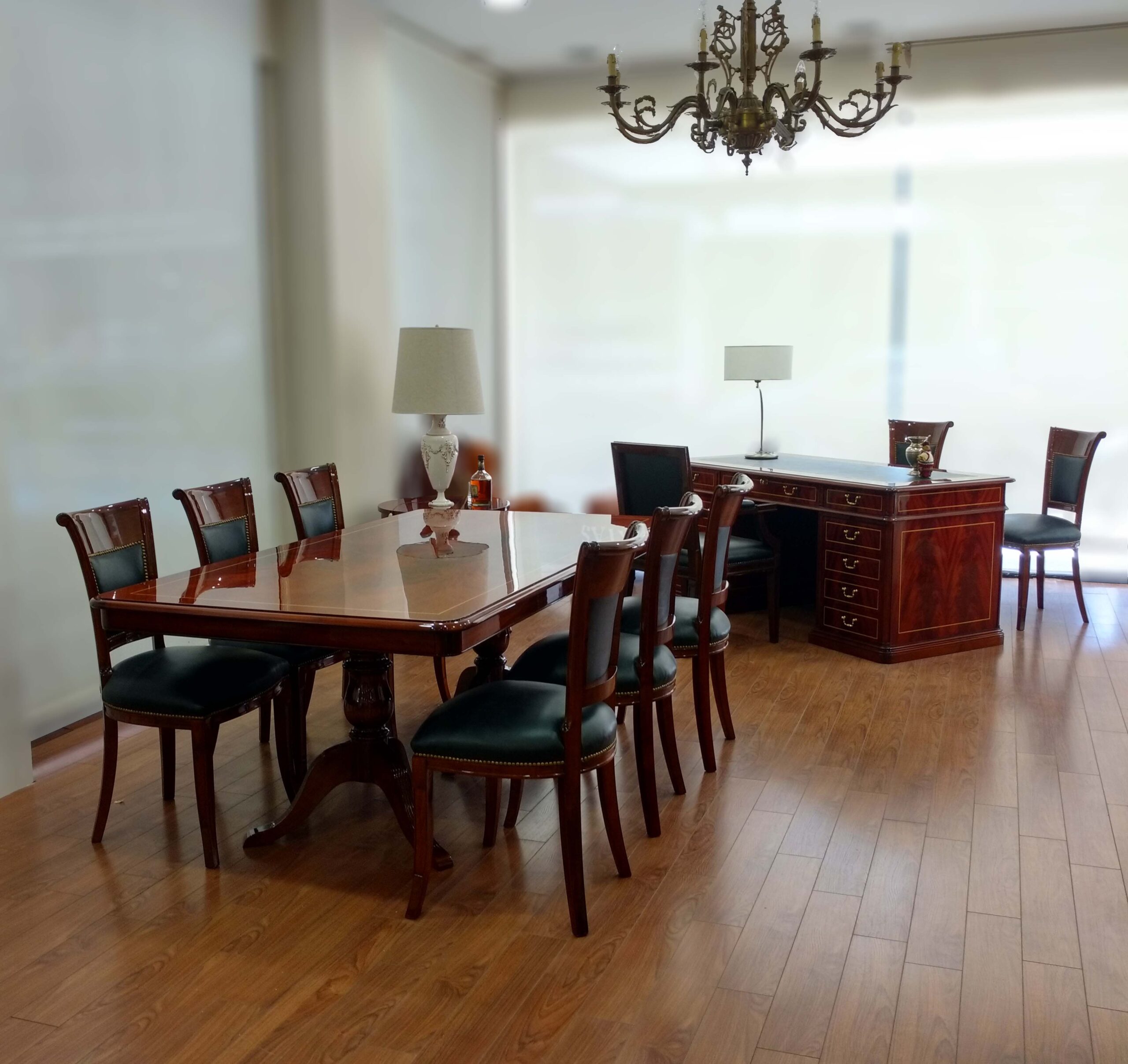 Mesa de directorio de estilo inglés con doble base Reina Ana, tapa en pluma de caoba y marquetería en fresno.