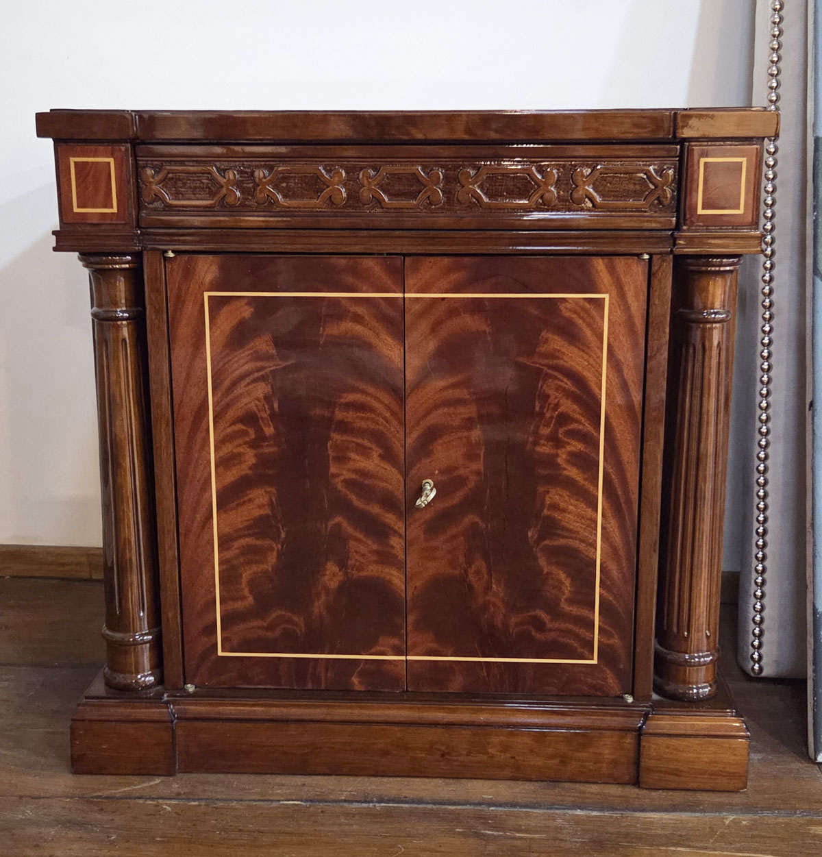 Mesa de luz modelo Imperio con columnas y 2 puertas. Construida en madera de caoba y pluma de caoba, con tallas y filetes en guatambú. Lustre Premium con base de poliéster y terminación en poliuretano, brillante.