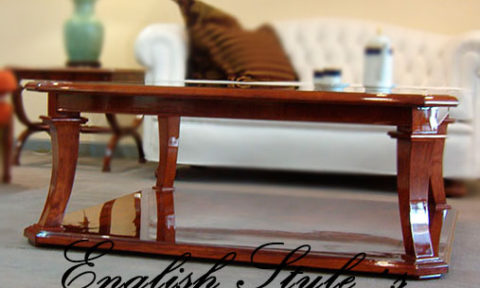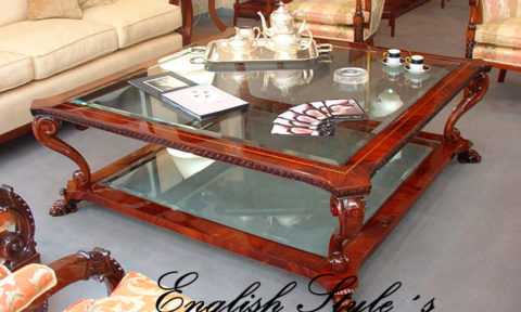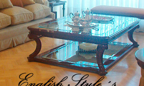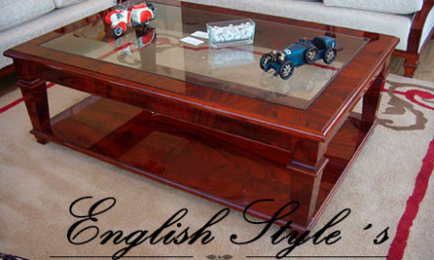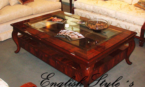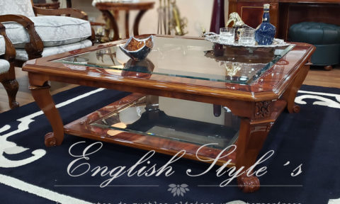 Mesa de centro modelo Sheraton Estrella. Impactante mesa de estilo en caoba y pluma de caoba con patas torneadas y tapa de vidrio biselado. En la foto, muestra de 200 X 150 cm. Lustre Premium brillante. Pedí la tuya en la medida que necesites, pudiendo elegir la madera, los detalles, el tono y el brillo