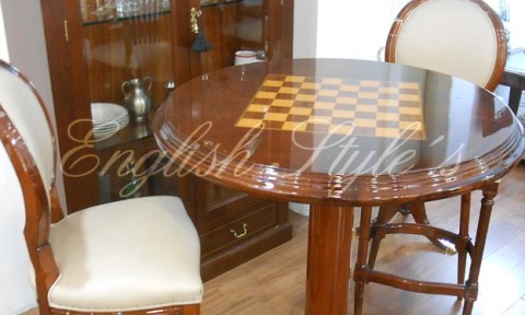 Mesa de Ajedrez con bochón. Construida en caoba y pluma de caoba con tablero de ajedrez en el centro, marquetería y base tallada. Lustre Premium con base de poliéster y terminación en poliuretano, brillante. Pedí la tuya en la medida que quieras, pudiendo elegir la madera, la base, los detalles, el tono y el brillo del lustre. Para