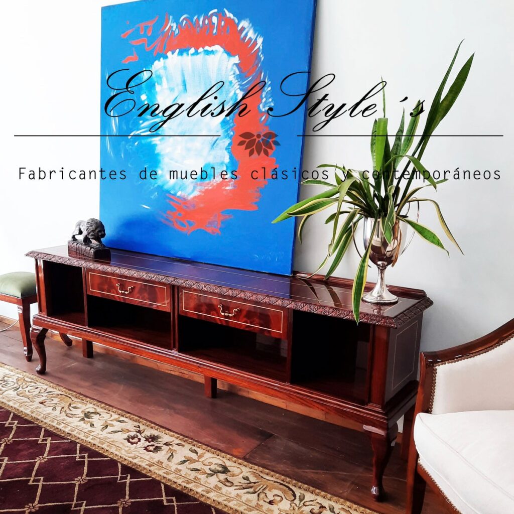 Mueble para TV con patas Reina Ana, construido en madera de caoba y pluma de caoba con tallas en el borde, 2 cajones y espacio de guardado. Lustre Premium con base de poliéster y terminación en poliuretano, brillante.
