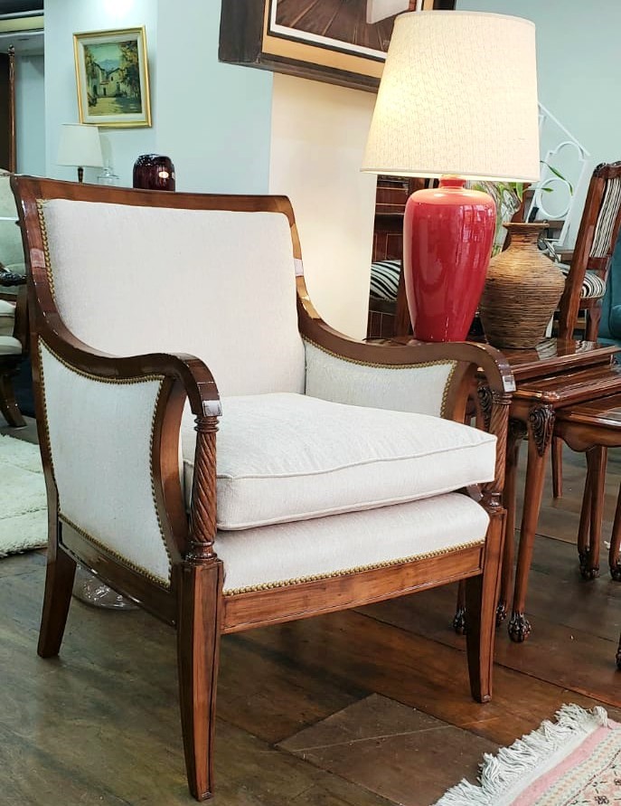 Sillón modelo Imperio con brazo torneado salomónico. Fabricado en madera de caoba con tapicería tradicional: cinchas naturales, mantas de yute, resortes de acero helicoidales, crin vegetal, almohadones de pluma. Lustre Premium con base de poliéster y terminación en poliuretano, semi-mate.