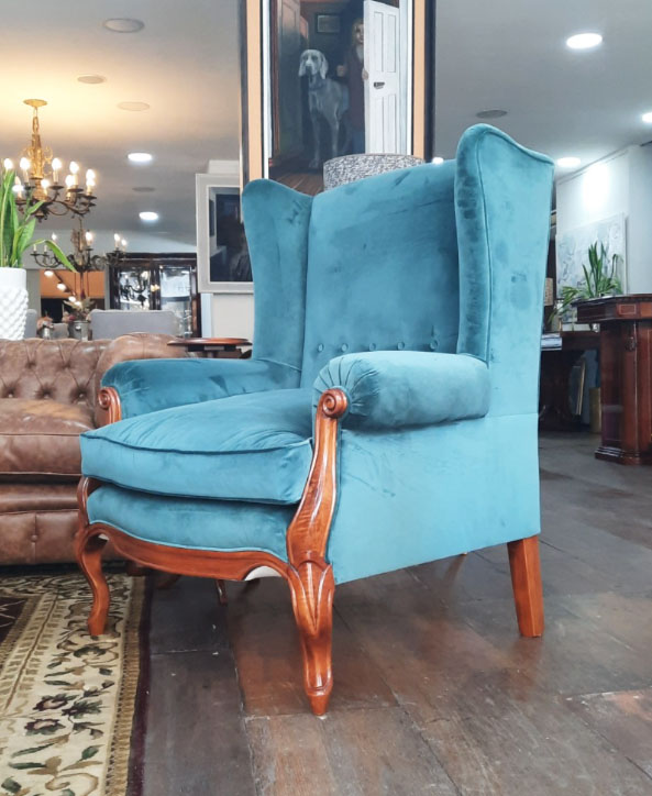 Sillón de living modelo Berger, terminado en pana verde con capitoné. Patas torneadas, lustre Premium con base de poliéster y terminación en poliuretano, semi-mate.