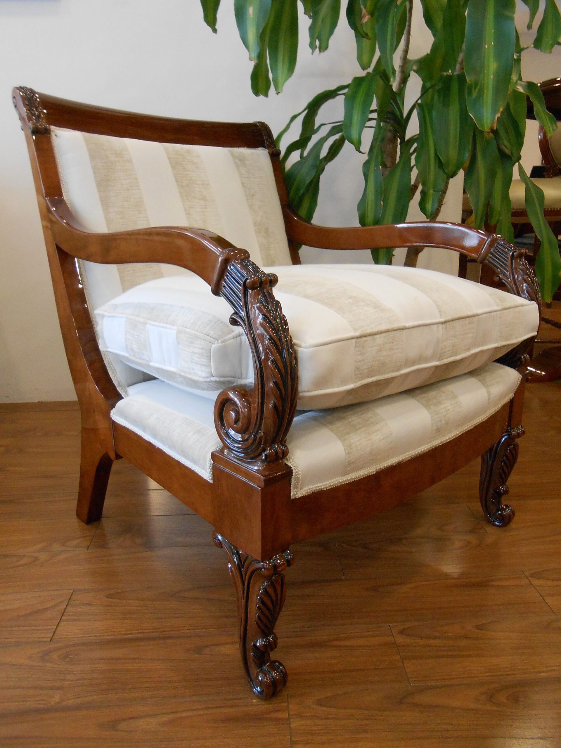 Sillón de living modelo Imperio con respaldo recto. Construido en madera de viraró; tapizado en asiento y respaldo, con cinchas de yute, resortes helicoidales de acero y crin vegetal.