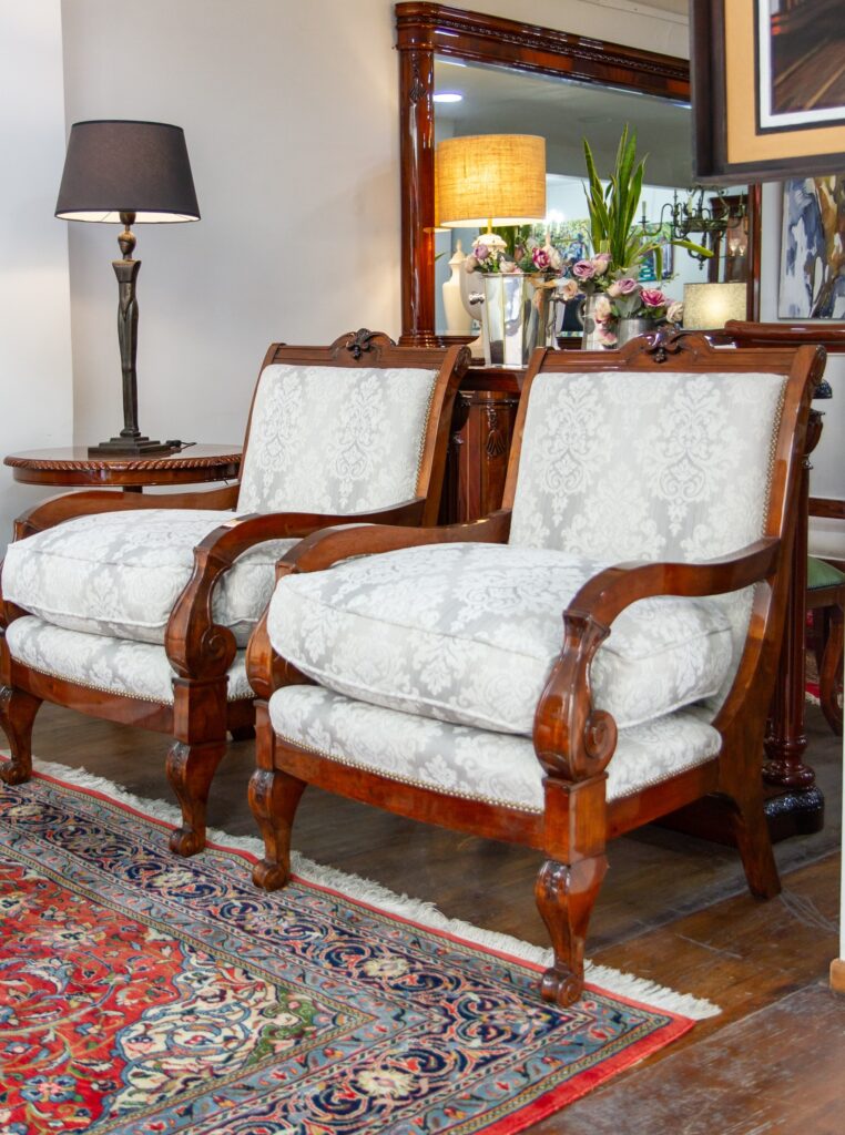 Sillón individual modelo Imperio con cabezal tallado y almohadón de pluma, terminado en jacquard con diseño de damasco. Lustre Premium con base de poliéster y terminación en poliuretano, brillante.