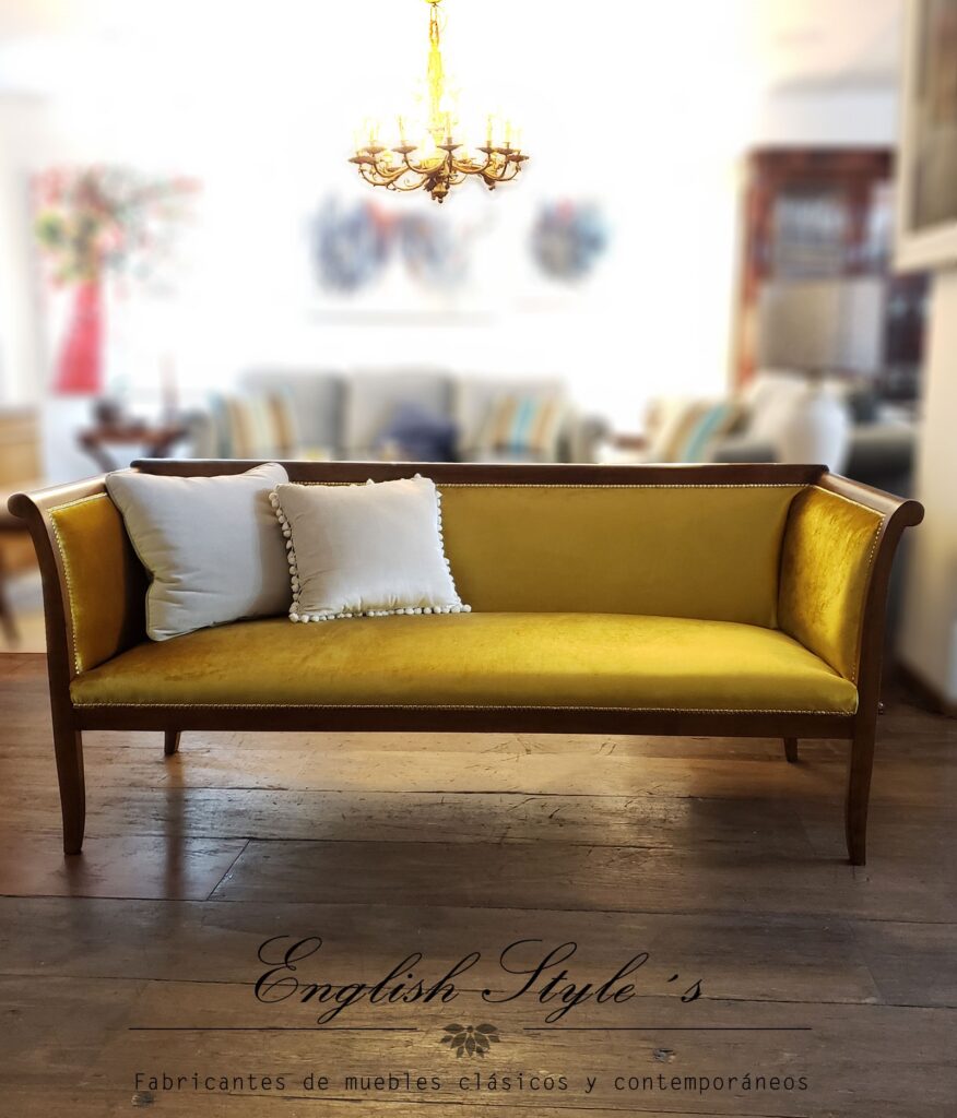 Sofá modelo Biedermeier terminado en pana dorada con madera a la vista. Tapizado de manera tradicional sustentable: con baranda elástica, resortes helicoidales de acero, fasón de crin vegetal y cinchas de yute. Lustre Premium con base de poliéster y terminación en poliuretano, mate.