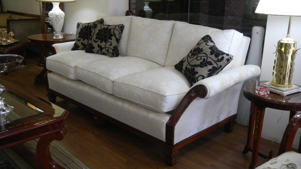 Sofá modelo Ivory con madera a la vista. Tapizado con cinchas de yute, resortes helicoidales de acero y crin vegetal. Lustre Premium con base de poliéster y terminación en poliuretano.