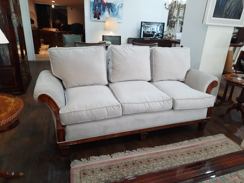 Sofá modelo Ivory; en la foto, muestra de 225x110cm. Base y frente de madera de caoba con patas talladas. Tapicería tradicional: cinchas de yute, resortes de acero, baranda elástica, relleno de crin vegetal, almohadones de plumas y bellón siliconado.