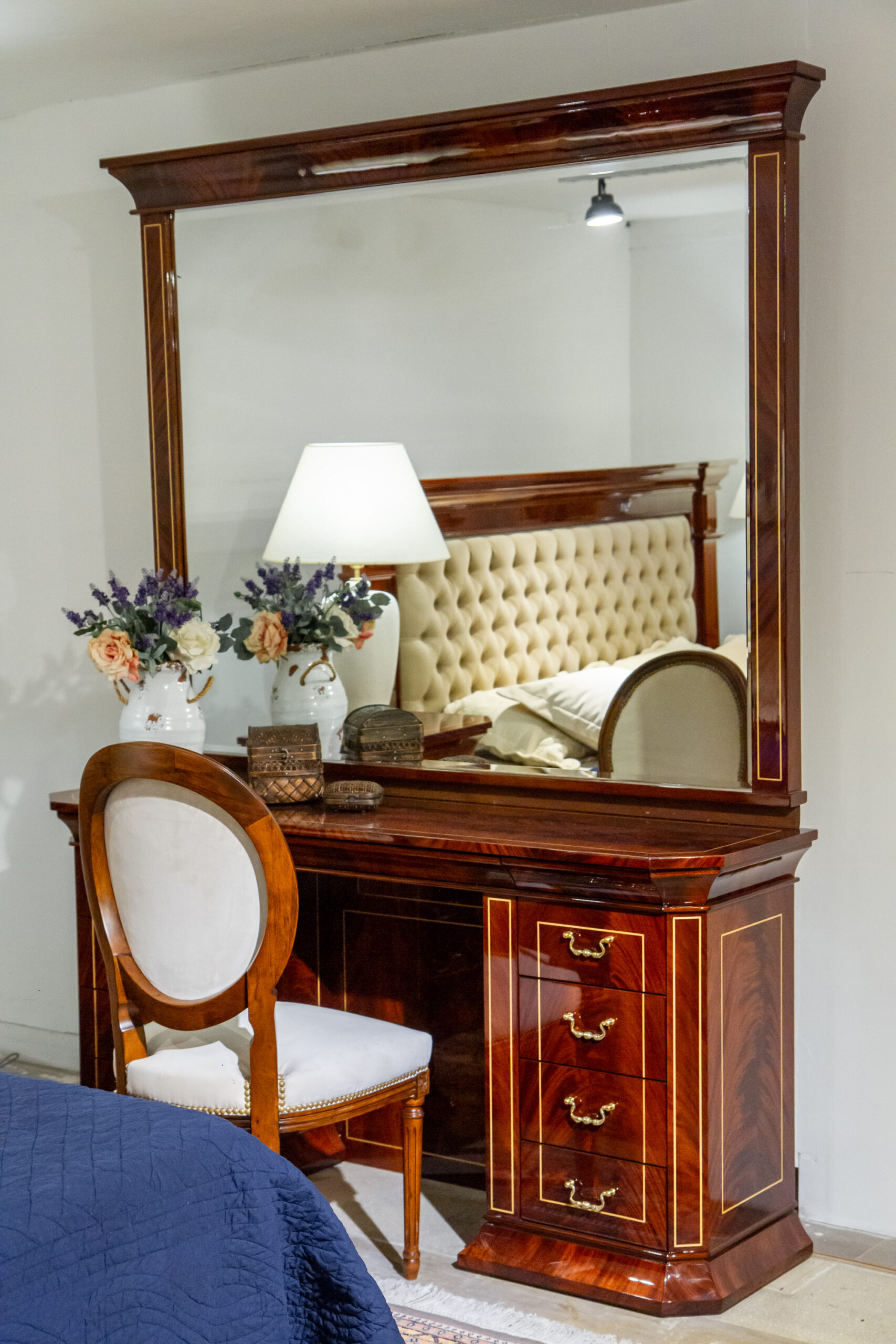 Tocador modelo Ochavado Cóncavo de 11 cajones, fabricado en madera de caoba y pluma de caoba con herrajes de bronce macizo. Lustre Premium con base de poliéster y terminación en poliuretano, color natural brillante.