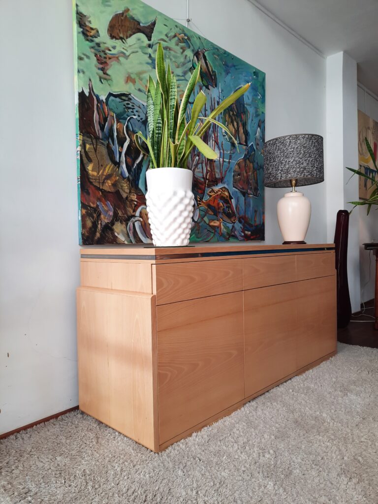 Vajillero modelo Dandelion con 3 puertas y 3 cajones, construido en madera de haya. Lustre Premium con base de poliéster y terminación en poliuretano, mate.